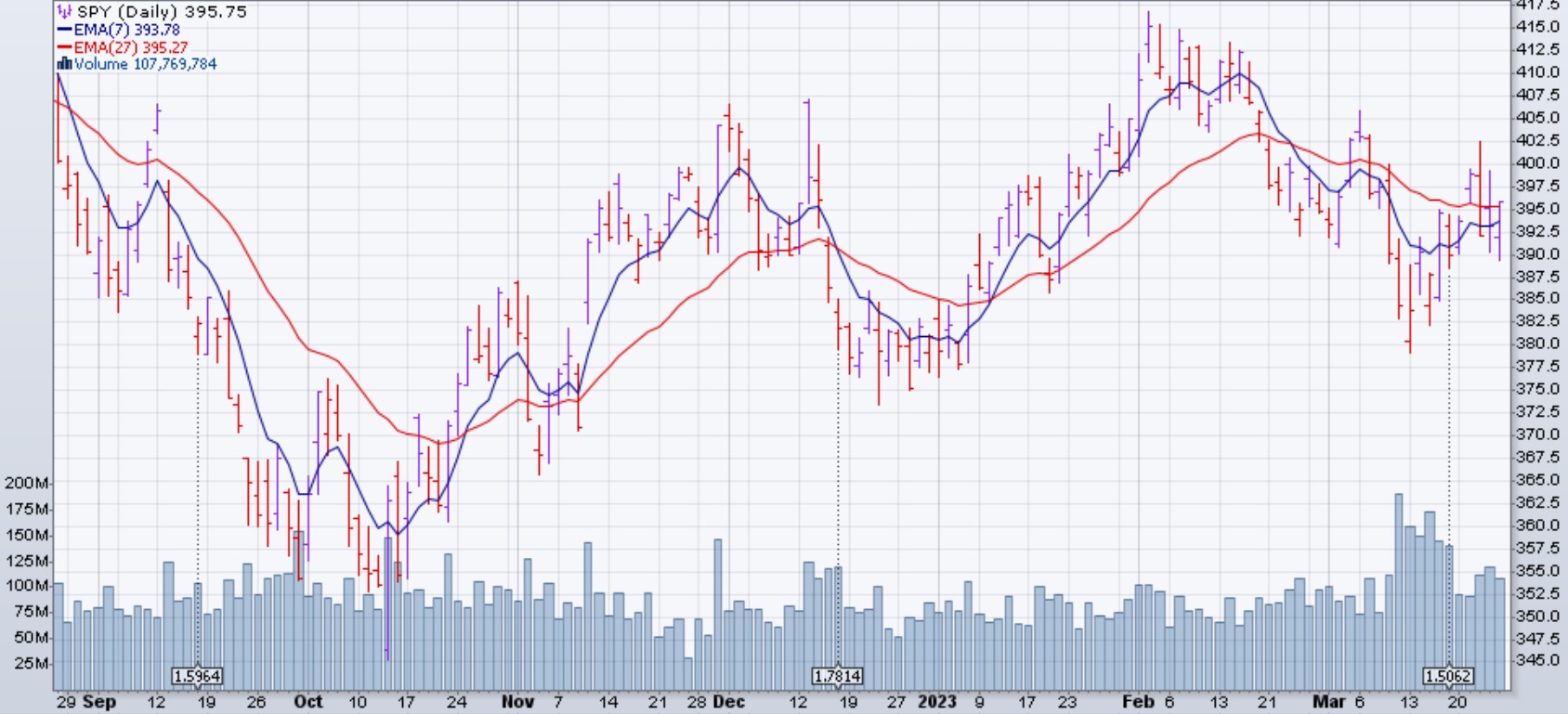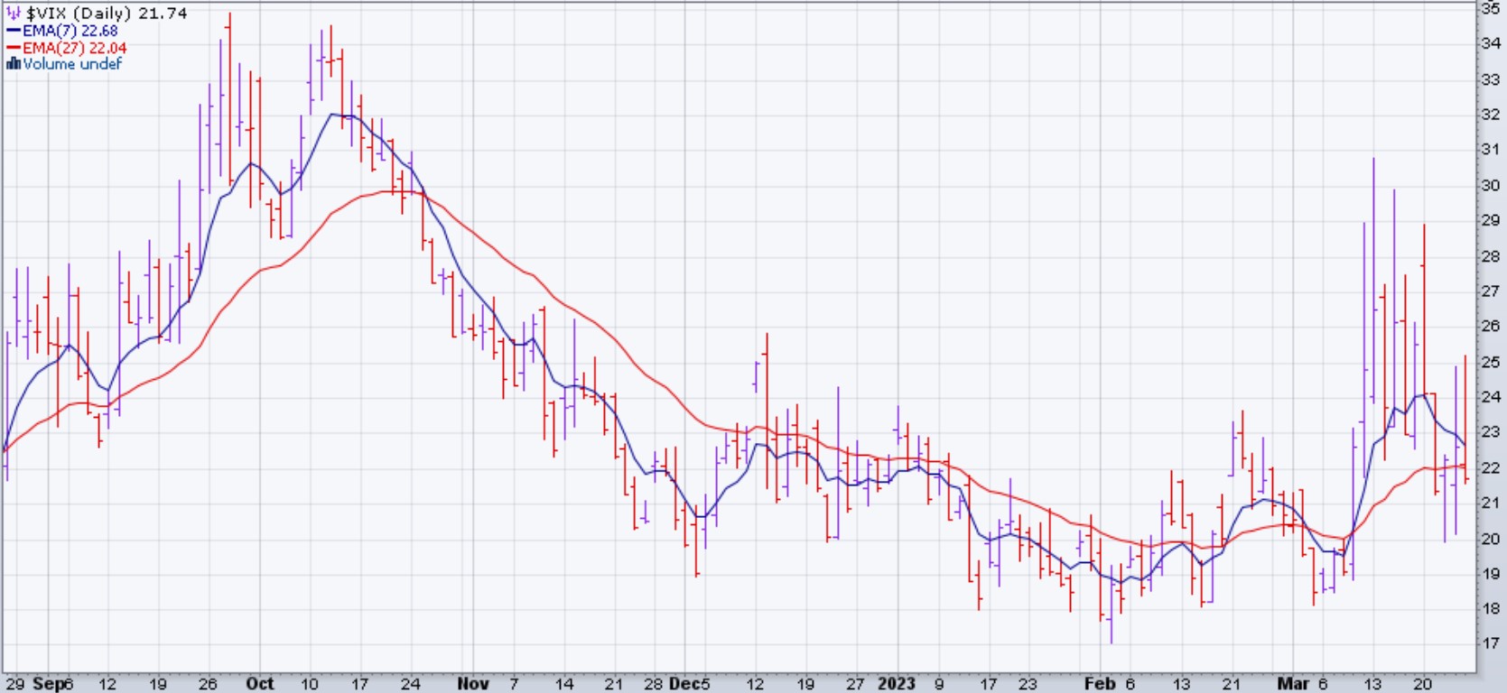 Depuis les problèmes récents de quelques banques, le VIX est monté jusqu'à 31% et ses EMA se sont croisés à la hausse. Par contre, il a conclu la semaine à environ 22% et ses EMA se sont rapprochées.