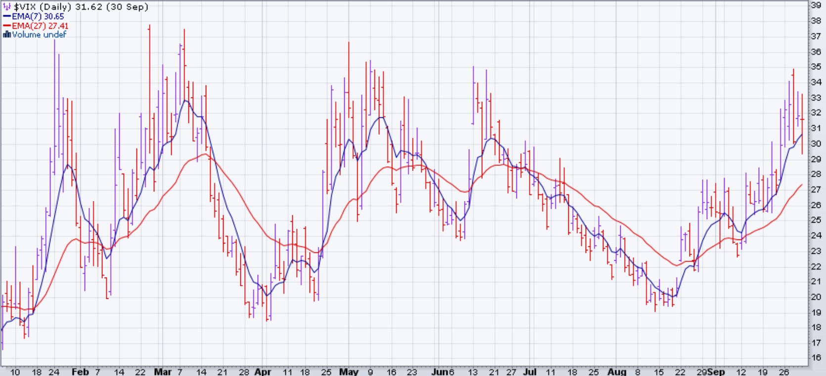 Le VIX a fini sa semaine à 31% et ses EMA sont toujours croisés à la hausse. La meilleure stratégie pour le marché actuel est de patienter et ne rien faire.