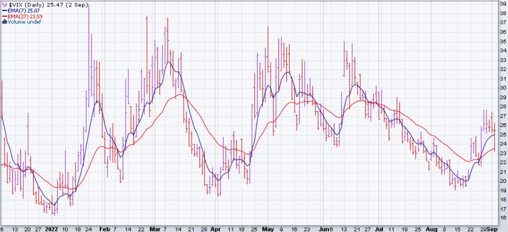Le VIX a conclu sa semaine à 25%: niveau dangereux pour le marché. Cependant, à court-terme il semble incapable de monter plus haut que 28%. Les EMA sont toujours croisées à la hausse, par contre, la distance entre les deux EMA a arrêté d'augmenter.