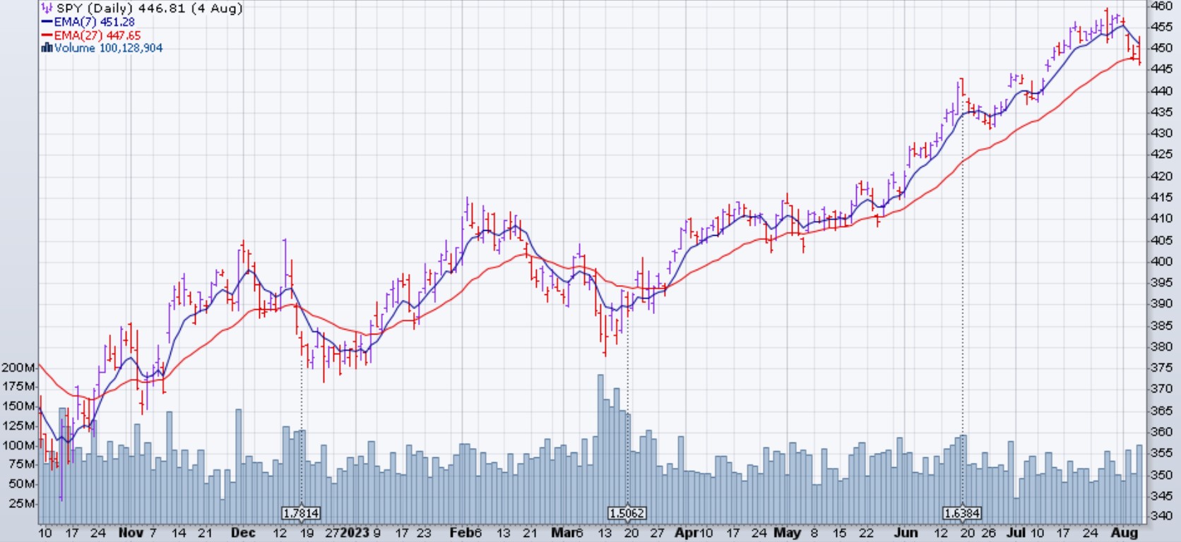 Le marché (SPX et dérivés) est descendu de 2.3% la semaine du 31 juillet 2023. La dégradation de la note de crédit américaine par Fitch à AA + a surpris les investisseurs, car elle représente la première dégradation du pays par une grande société de notation depuis 2011. Elle survient environ deux mois après que les États-Unis se sont rapprochés d'un défaut qui a finalement été évité après que les législateurs ont accepté de lever le plafond de la dette. Les États-Unis sont toujours notés AAA par les autres grandes agences de notation - Standard & Poor's et Moody's - et la secrétaire au Trésor Janet Yellen a qualifié le changement de Fitch d'"arbitraire et basé sur des données obsolètes".