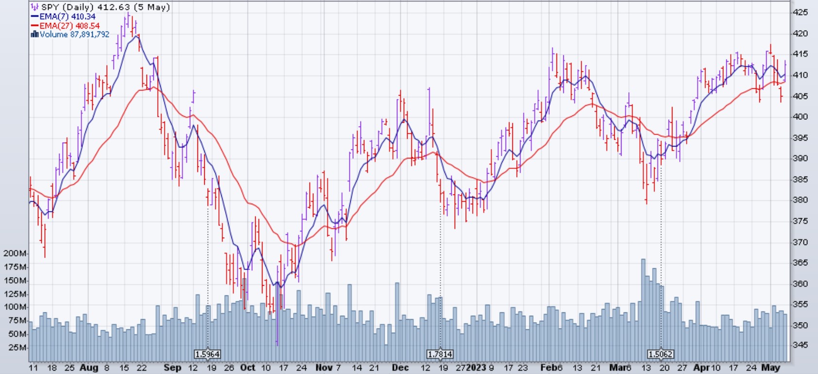 Le SPY a conclu sa semaine a 412.63$. Pour une deuxième fois cette année, le marché a été incapable de monté plus haut que 420$. Depuis un mois, il est en congestion.